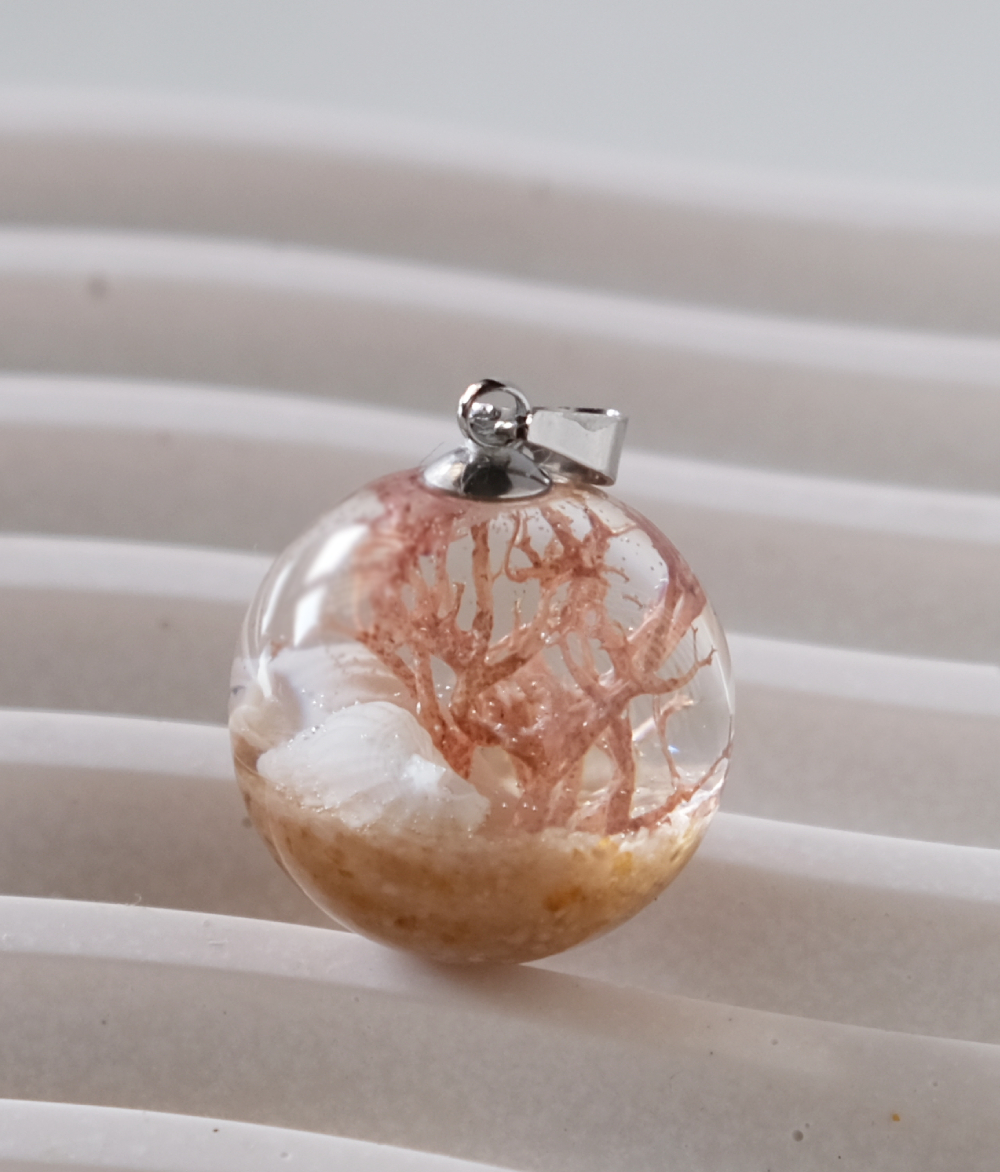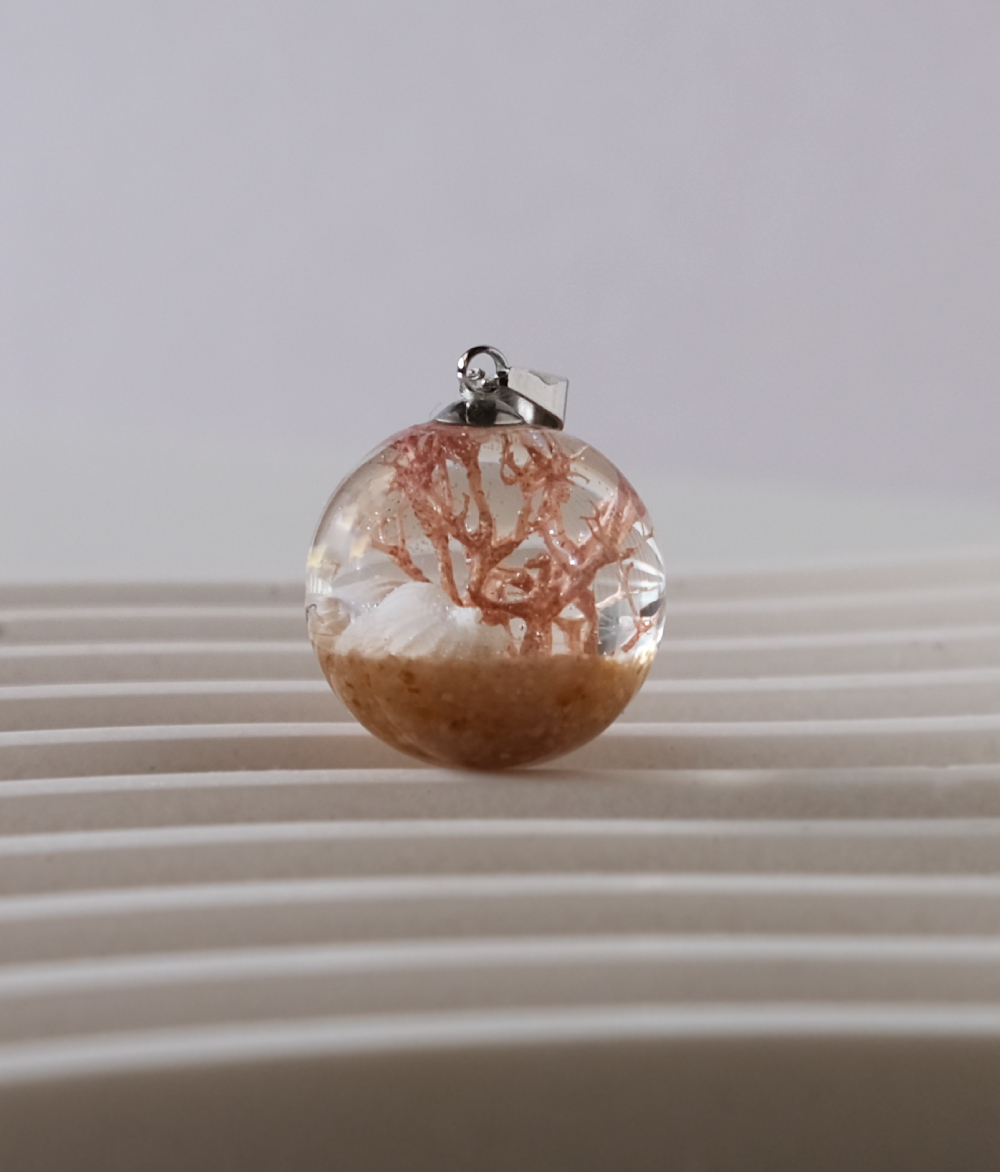 Collana con ciondolo interamente realizzato a mano che ingloba elementi naturali (muschio, sabbia, conchiglie) ricordando la brezza marina ed il profumo del sole.