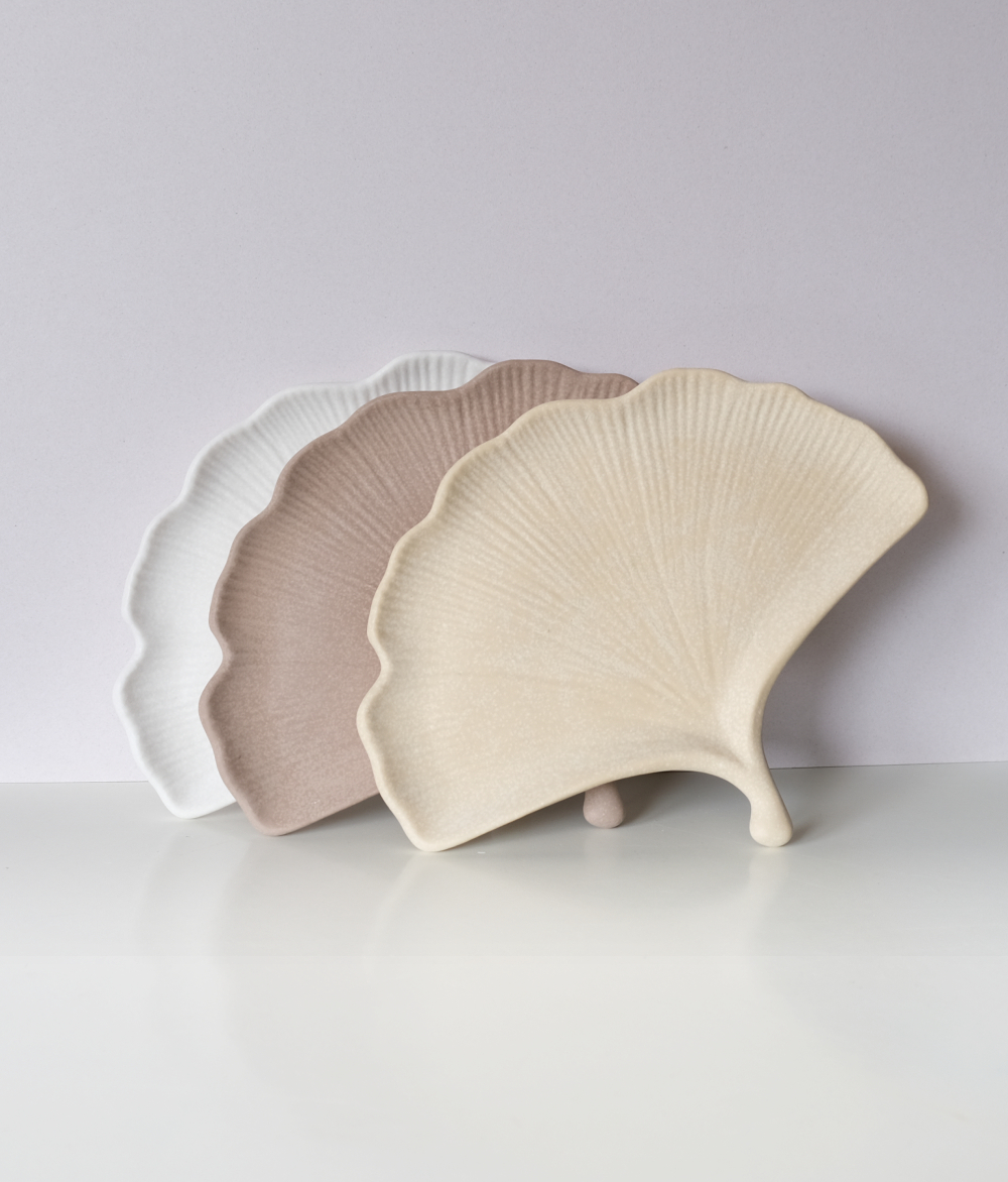 Vassoio a forma di foglia di ginkgo. Adatto a qualsiasi tipologia di ambiente: su un comodino può accogliere i gioielli più preziosi, in bagno può contenere trucchi ed accessori, in salotto gustose praline...
